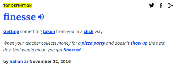 Методом заработка для подростков вторым по обороту денег, но не по частоте занимает грабеж(первым - наркоторговля). "Зафинессить" кого либо - это быстрый метод добыть себе денег на кондомы чтобы пойти к подружке, или попить пива с кентами. Детям и подросткам свойственно кучковаться в группы по интересам или чему-либо еще, будь то скейтеры, спортсмены, либо же шахматисты.